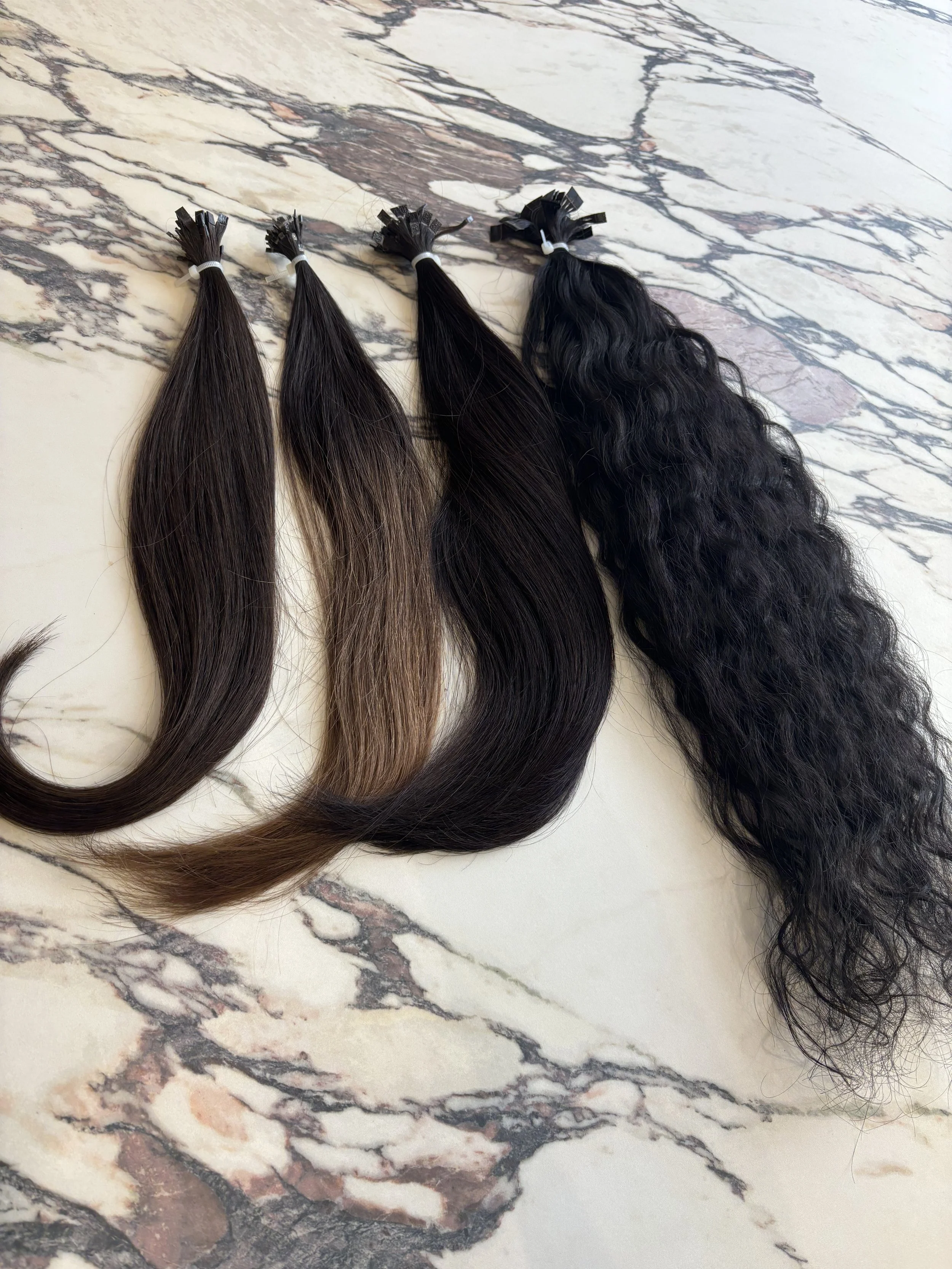 Also known as fusions, hot fusions, K-Tip or individual bonds. This is my favorite method! When installed correctly, bonds are lightweight, discreet, flexible, and durable. They’re attached by molding a keratin tip containing an individual bundle of hair around an equal amount of your hair. These can last between 3-4 months straight with no maintenance. The hair is not reusable.
